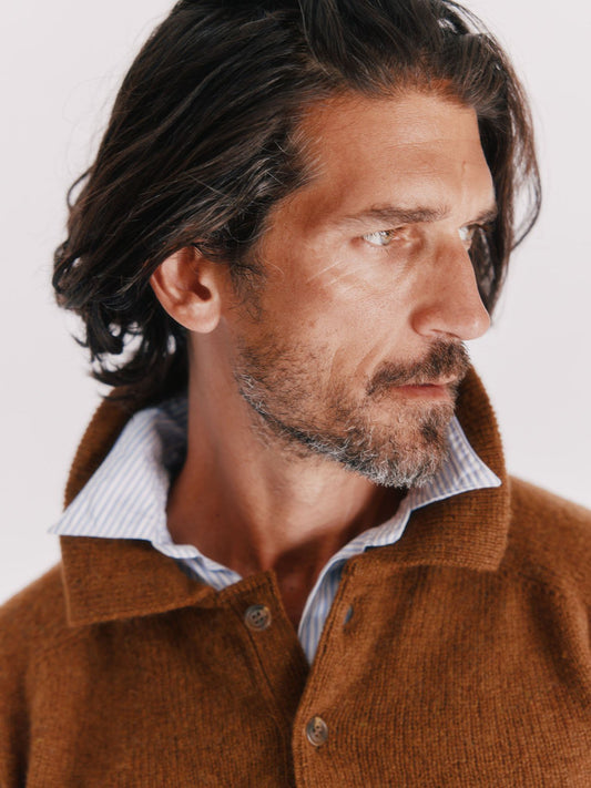 Harley of Scotland Mens Shetland Eton Collar Sweater - Pecan Brown