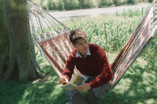 Harley of Scotland Mens Shetland Eton Collar Sweater - Bordeaux Mix Burgundy