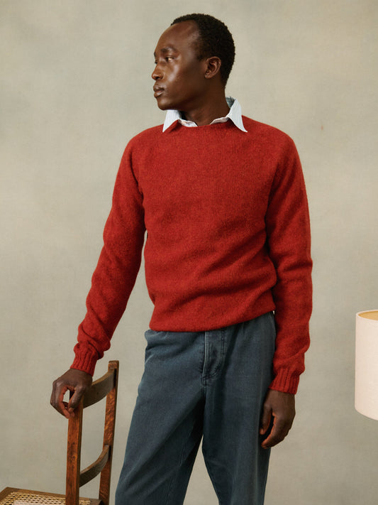 Harley of Scotland Mens Seamless Saddle Shoulder Shetland Sweater - Blaze Rust Red
