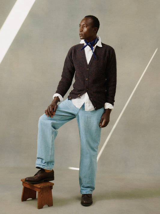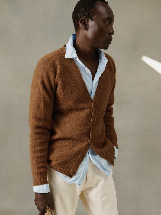 Harley of Scotland Shaggy Shetland Men's V Cardigan - Pecan Brown