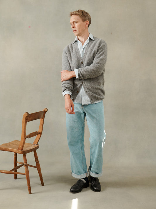Harley of Scotland Shaggy Shetland Men's V Cardigan - Med Grey
